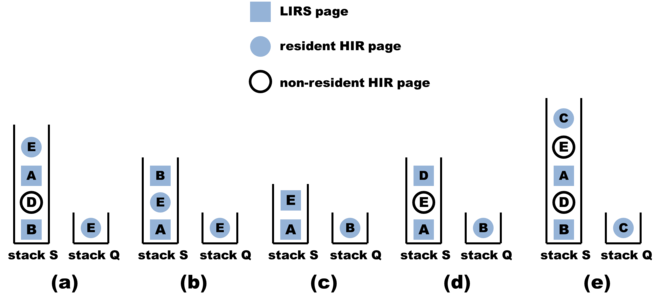 The cache is divided into two partitions: a Low Inter-reference Recency (LIR) partition which forms most of the cache and a High Inter-reference Recency (HIR) partition. All LIR entries are resident in the cache, while only some of the HIR entries are resident. All recently-referenced cache lines are placed in a FIFO queue called the LIRS stack S. Resident HIR entries are also placed in a FIFO queue called the stack Q.